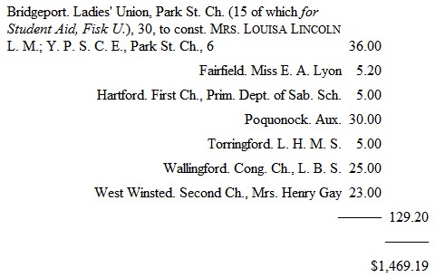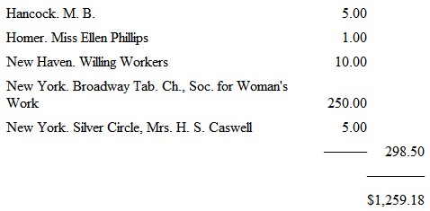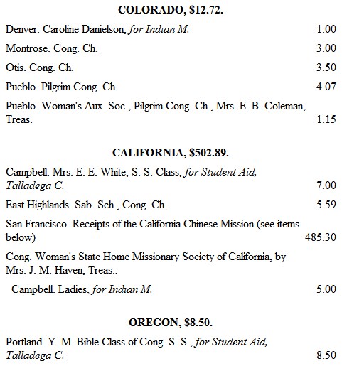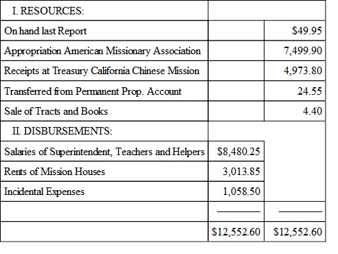 Offerings of our Brethren.—It is not possible to segregate their gifts to our treasury with perfect accuracy, but we are within the truth when we place them at $1,905.40. In addition to this they have given for the local expenses of their several Associations $1,134.10, for Missionary Work in China $675.65, for their Worldwide Missionary Society (through the American Board) $63.60, and for relief to needy brethren and others $358, making an aggregate of $5,136.75 as their offerings for the year; and this, be it understood when the pressure of the times cannot but be felt by them, on the average, more severely than by any others. The goods a Chinaman has to sell are likely to be those that in hard times we dispense with. If wages are to be reduced, the reduction begins with the Chinaman. It is no great sin in the view of many to steer clear of paying a Chinaman. If anybody is to be dismissed from service when economy begins it is the Chinaman. We cannot but think that under the circumstances the financial showing at this point is highly creditable.