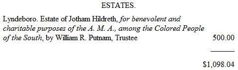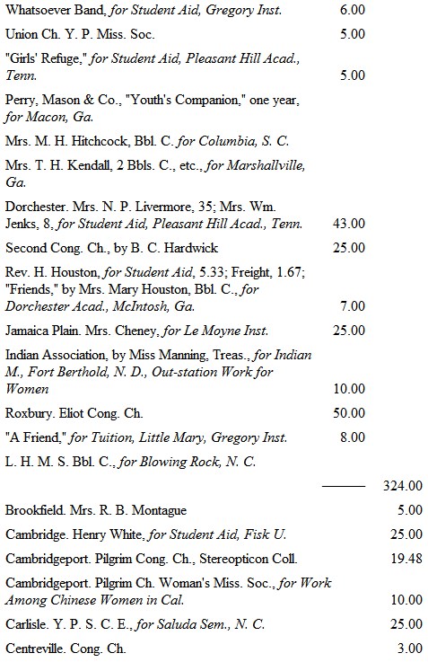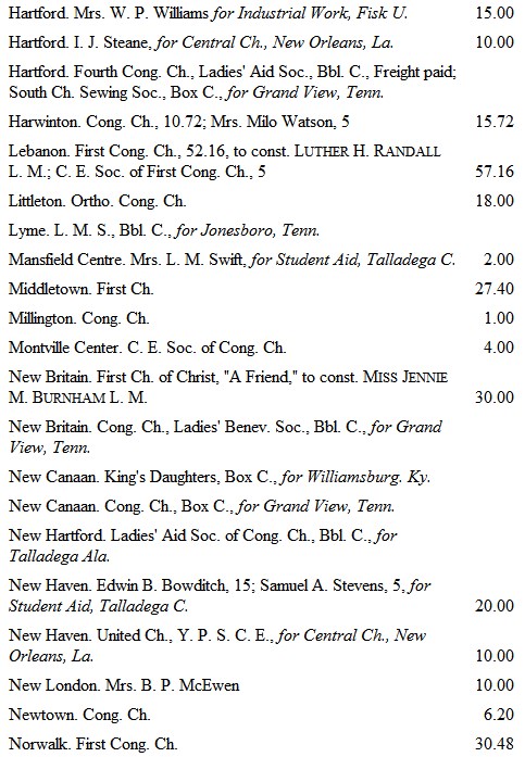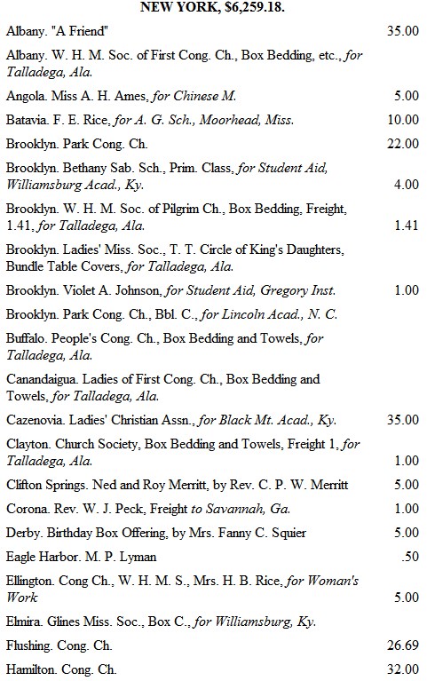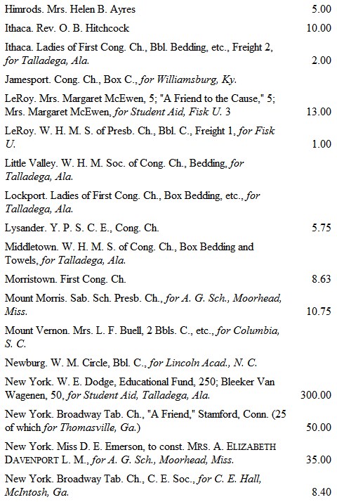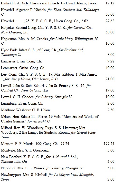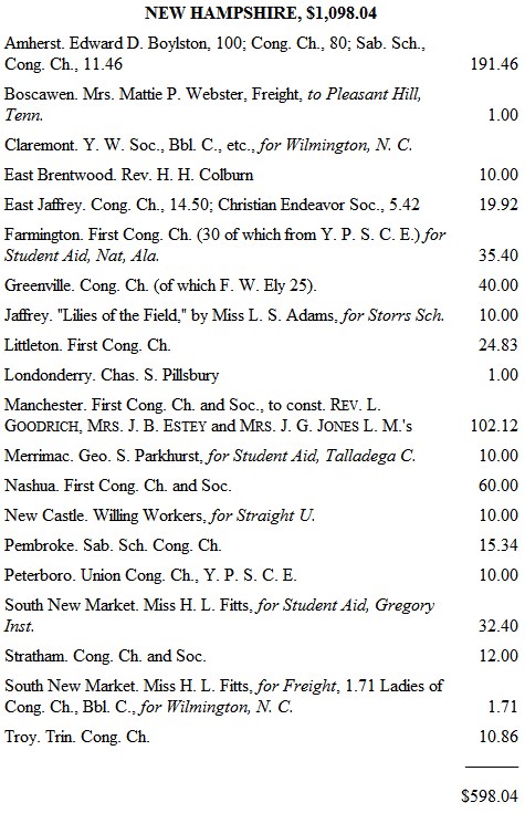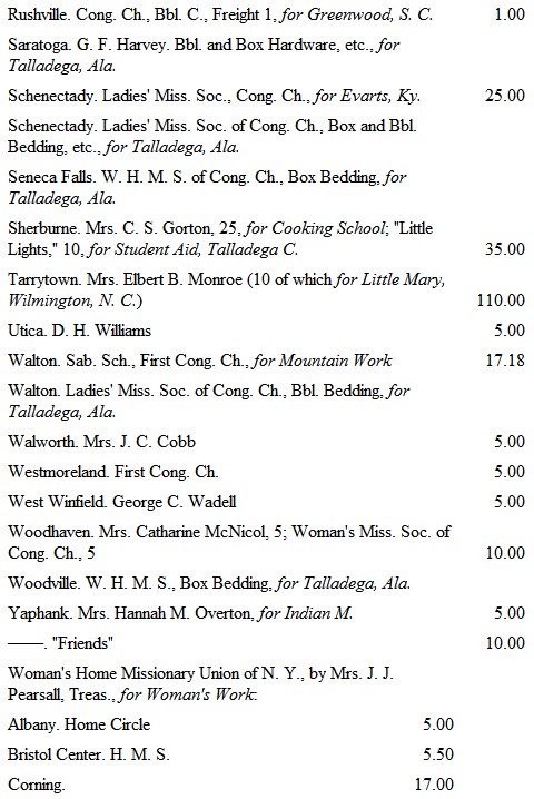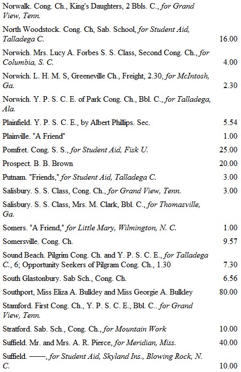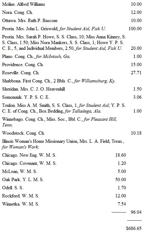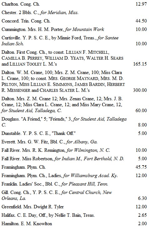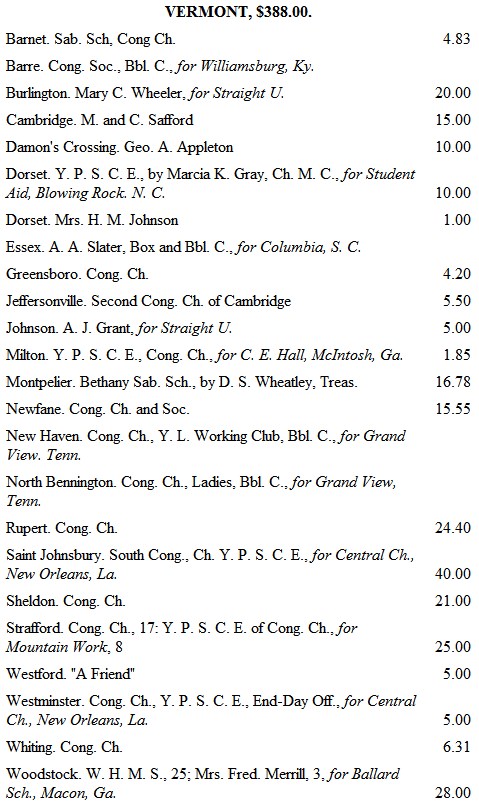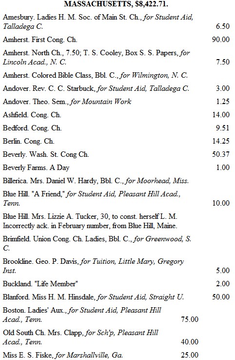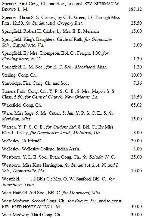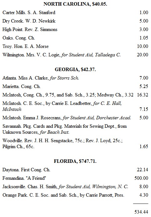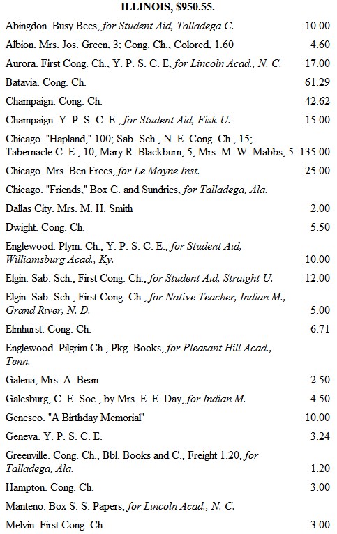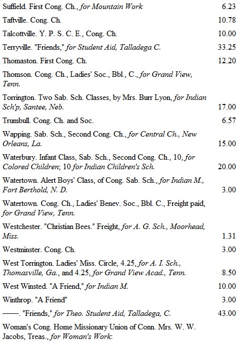 Miss Amy Williams entered the service of the Association in 1868 as missionary teacher at Augusta, Ga. The next year she was transferred to Atlanta, Ga., where she was for many years the principal of the Storrs School. Retiring from this principalship in 1885, she spent a few years North, but her heart continually turned to her loved people, and in 1893 she accepted appointment as principal of the Slater Normal School, at Knoxville, Tenn., where her work was characterized by the same thoroughness and ability as that at Atlanta. Finding that her health would not permit her to return the second year, she wrote in December: "My heart just aches to go back South. Every other work seems insignificant."