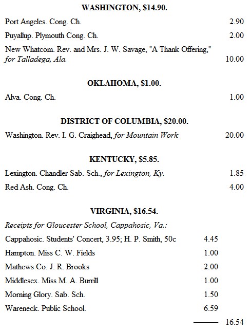"Two of the mission people started the pledge with twenty dollars each. That rather startled the people, but several soon ventured ten dollars each. Then one pledged ten dollars on condition that nine others pledged the same. The nine were found. One Indian woman pledged ten dollars. Several Indians put down four, five, six and seven dollars each. We would sing and then call for pledges; speak and sing again, and then pledges again. The committee was instructed to canvass the matter farther immediately. The work is now going on outside. In the meanwhile the pledges are being paid very fast, and I expect to be able to remit to you soon. This contribution from Pilgrim Church means much from the hearts of our members. They have gone right down to the suffering point in this giving. The pupils in the school have done well in helping, too. I have been astonished that many members of America's great churches think that missionaries and people in our mission fields are only recipients. I wonder if the good people in all our large churches did as much to lift the debt of the American Missionary Association on Lincoln Memorial Sabbath as did the members of this Indian Mission Church on the prairie. If so, the debt is wiped out."