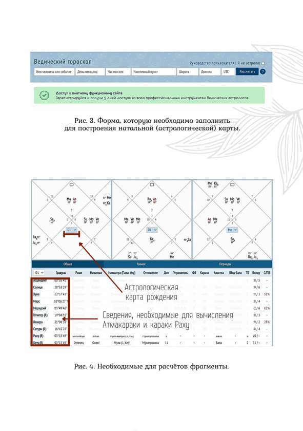 Введите в форму, показанную на рис. 3, данные своего рождения и нажмите на кнопку РАССЧИТАТЬ. Программа построит вашу натальную карту с разными дополнительными сведениями. Нам будут нужны те фрагменты, которые я выделила на рис. 4, а именно: астрологическая карта рождения, сведения для вычисления Атмакараки и караки Раху.