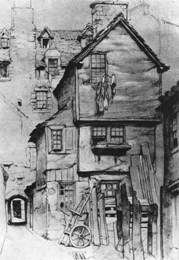 Школьный проезд. На этой улице находился дом, в котором родился Вальтер Скотт. Рисунок цветным карандашом Джеймса Драммонда, 1856
