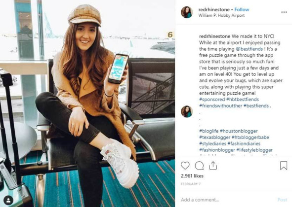 Спонсируемые сообщения, в которых знаменитости и деятели социальных сетей демонстрируют продукты, которые они использовали в последнее время (отмечены #ad или #sponsored) – это самые распространенные примеры из маркетинга влияния. Простой пример – влиятельная личность Redrhinestone показывает, как мобильная игра Best Fiends помогла ей скоротать время в аэропорту.