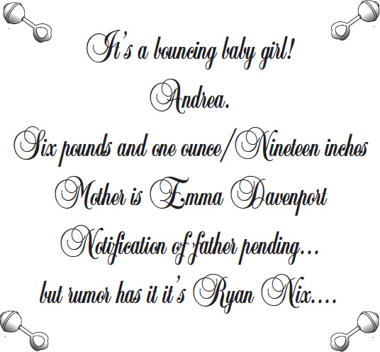 How could that tiny form be partly his? Even when Ryan, Jr. was small, he hadn’t been that small. Or that delicate. Beautiful. Like Emma.