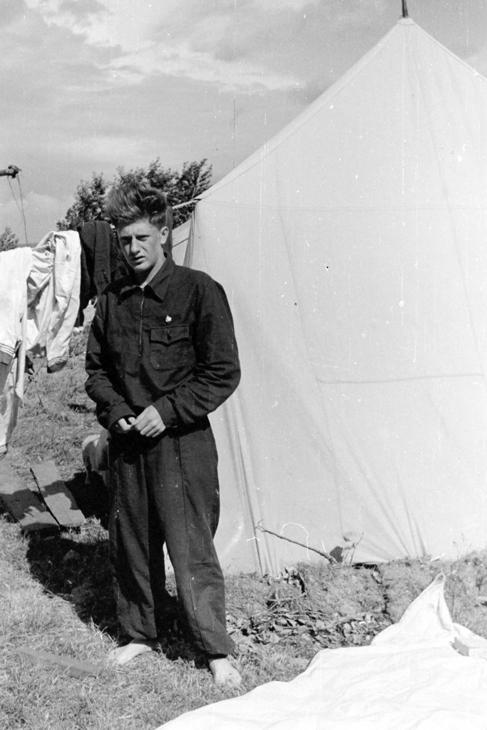 Летний спортивный лагерь ДСПШ на территории яхт-клуба «Водник», 1956 г. Игорь Доминяк рядом с палаткой, в которой мы жили.