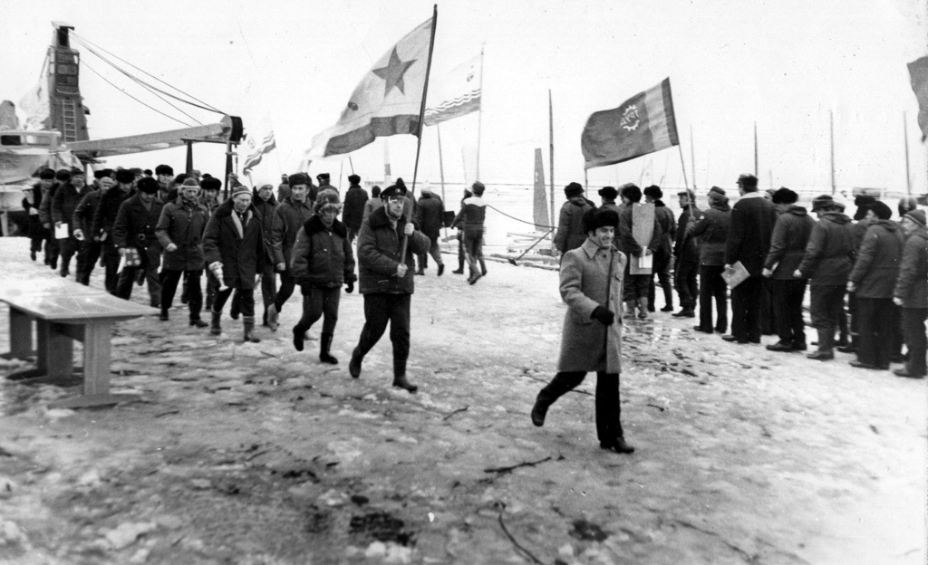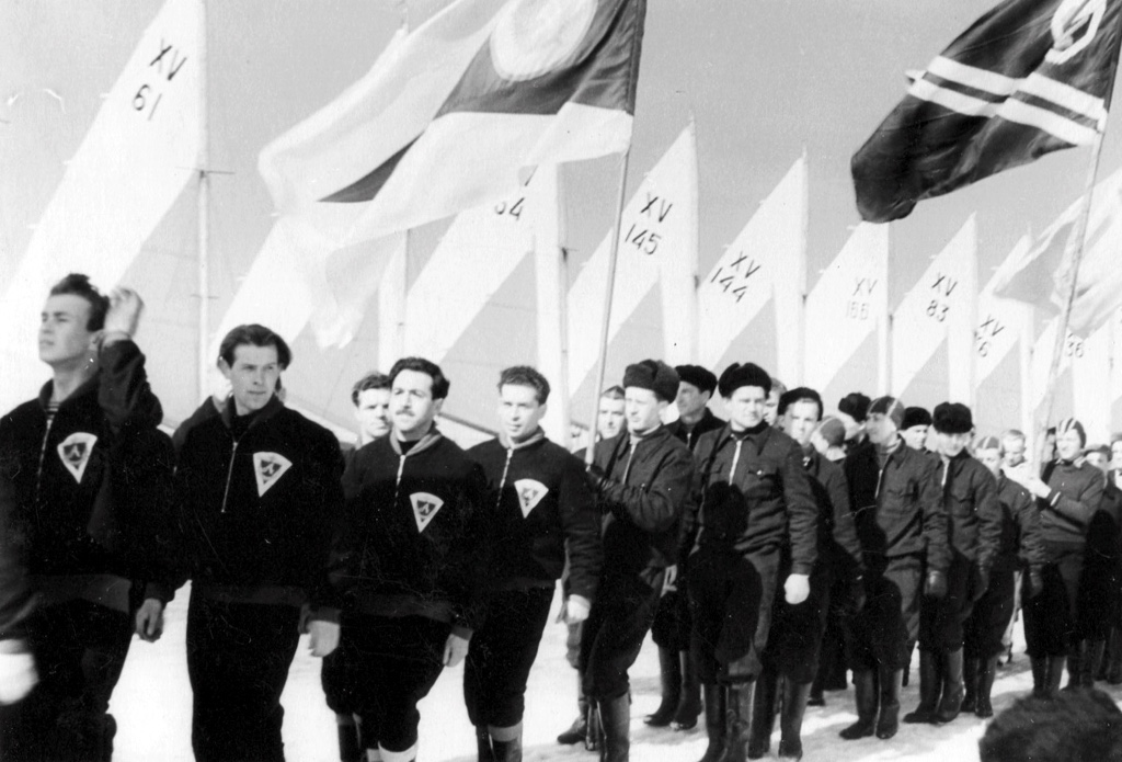 Парад открытия Чемпионата СССР 1957 года. Слева направо: второй Виктор Поппель, Борис Кулаженков (шкотовый Виктора Шапочкина), Михаил Песочинский (кажется шкотовый Николая Матвеева), Павел Паршин (шкотовый Виктора Горлова), Игорь Доминяк с флагом ДСО «Красная Звезда», за мной, правее Геннадий Семенович Назаров.