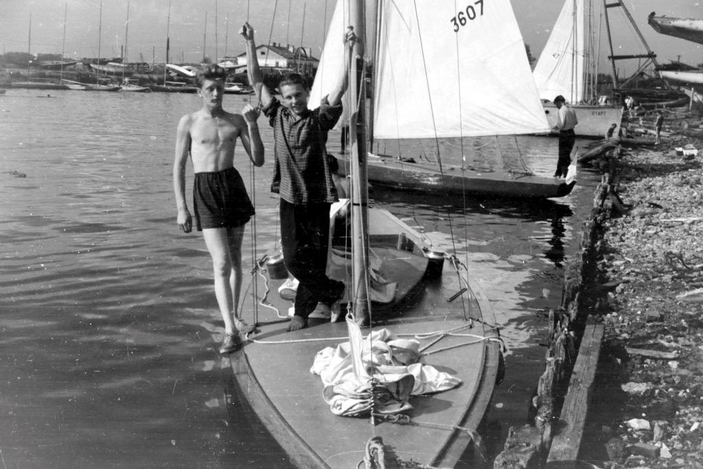Я (слева) со своим одноклассником Женей Морозовым перед выходом из рабочей гавани в залив на новом драконе D SR-146 «Сокол», 1957г.