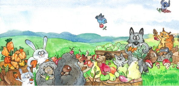 Лес укрылся новым пледомЗолотого сентября.Журавли летят за летомЧерез горы и моря.Нынче лето провожаем,Завтра осень в гости ждёмС добрым, щедрым урожаем,С молодым грибным дождём.А в глуши густого лесаСказка прячется от нас.Будет очень интересноЗаглянуть в неё сейчас.Здесь, от глаз людских подальше,Гул стоит, костёр горит,Здесь уже с утра пораньшеЧудо-ярмарка царит.Продают ежи опята,Воз капусты лось привёз,Воробья зовут зайчата,Чтоб купил у них овёс.Горы ягод, вёдра мёда,Квас и свежий каравай,Всё, чем потчует природа,Нюхай, пробуй, наливай!Никого здесь не пугаютСовы, лисы, кабаны,Лишь орехи покупаютУ бельчат за полцены.