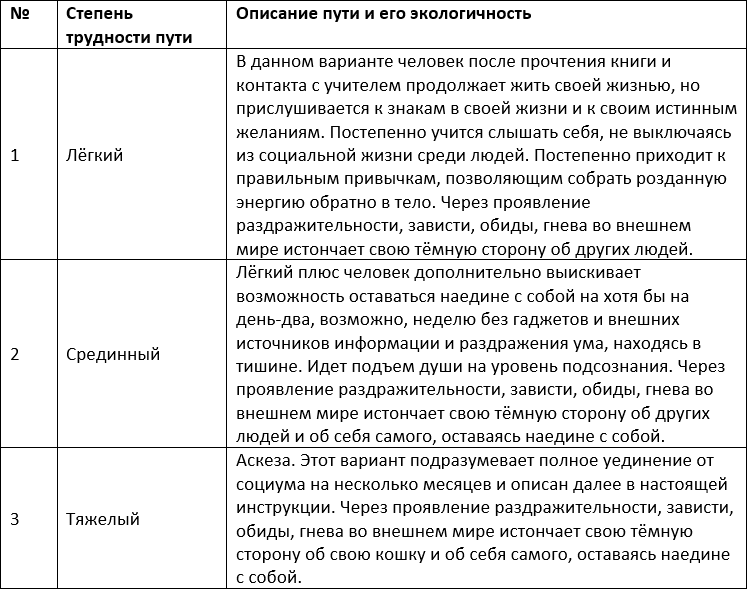 Тяжёлый путь показан только для человека с душой с соотношением света и тьмы 90/10. При меньшем соотношении уровня света рекомендуется сначала истончить свою теневую сторону до этого уровня за счёт прохождения через жизненные события/испытания, проработку страхов, наведение порядка в своей жизни. Важным является соблюдение безопасности – при попытке пройти с уровня 50/50 сразу в аскезу высока вероятность шизофрении.