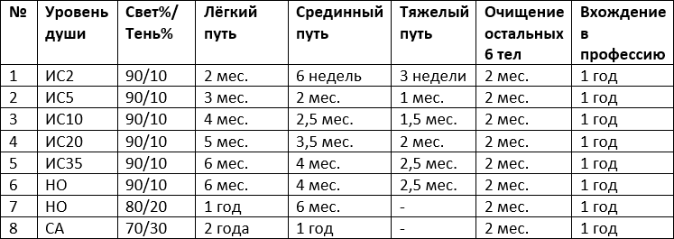 Ориентировочная скорость прохождения к ресурсу души в зависимости от уровня души (при условии контакта с одним из учителей):