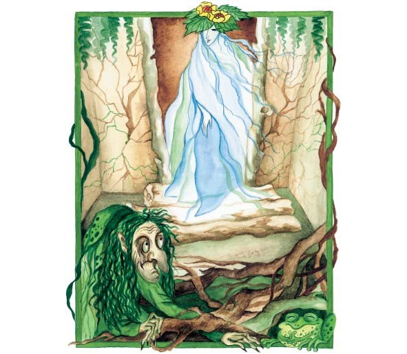 Когда Мастер Медведь подошёл к Болоту, ему послышался плач – тоненький и горестный, так мог плакать только сильно обиженный ребёнок. Мастер Медведь терпеть не мог, когда обижали маленьких. Он раздвинул заросли и увидел мешок, из которого выглядывала крохотная зеленоволосая девочка.