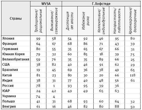 Результаты оценок Г. Хофстеде и WVSA хорошо дополняют друг друга и могут быть выражены в единой 100-балльной шкале (табл. 1.1). Кластерный анализ позволяет разделить исследуемые страны на несколько групп в соответствии с их культурными особенностями – англосаксонские, североевропейские, восточноазиатские, африканские, арабские и т. д.
