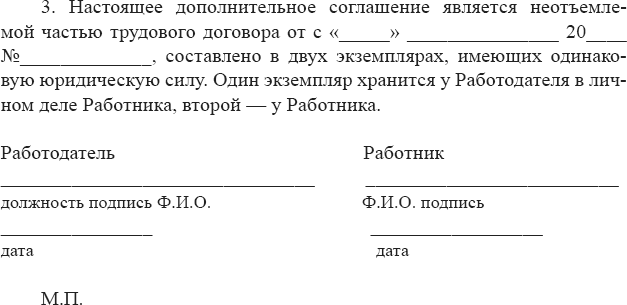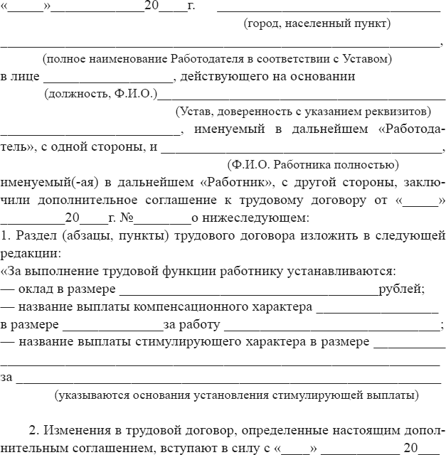 * Примечание: «Дополнительное соглашение» – название, применяемое в общегражданском законодательстве. В трудовых отношениях используются также названия: «Приложение к трудовому договору», «Отдельное соглашение сторон трудового договора» (ст. 57 ТК РФ).