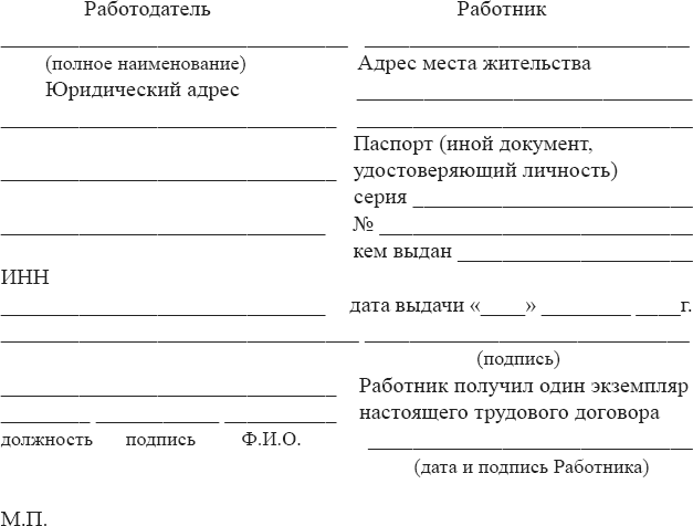 Трудовой договор заключается в письменной форме, составляется в двух экземплярах, каждый из которых подписывается сторонами. Один экземпляр трудового договора передается работнику, другой хранится у работодателя. О получении своего экземпляра договора, работник делает надпись на экземпляре работодателя, заверив ее своей подписью и поставив дату. Оба экземпляра оформляются как подлинники (не копии) и имеют одинаковую юридическую силу. Если одной из сторон трудовой договор утрачен, восстановить его можно по экземпляру другой стороны.
