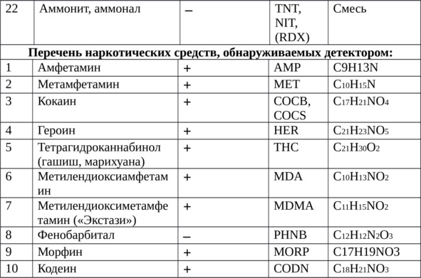 ИДД «КЕРБЕР» настраивается на предприятии-изготовителе для детектирования специфицированной группы веществ. Дополнительные вещества могут быть добавлены предприятием-изготовителем. Для получения детальной информации необходимо связаться с представителем предприятия-изготовителя.