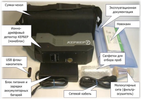 В стандартную комплектацию входит сумка-чехол, ионно-дрейфовый детектор «КЕРБЕР» (моноблок), USB флэш-накопитель, блок питания и зарядки аккумуляторных батарей, сетевой кабель, молекулярные сита (фильтр-осушитель), салфетки для отбора проб, новокаин (применяется в качестве калибранта для режима детектирования положительных ионов), эксплуатационная документация.