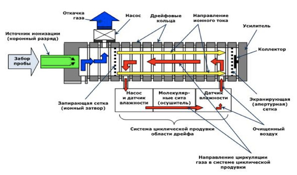 Неионизированные молекулы целевых веществ и воздуха удаляются из системы, а полученные ионы удерживаются в камере ионизации с помощью ионного затвора. Через определенные промежутки времени ионный затвор открывается, и порция ионов попадает в камеру дрейфа с градиентом электрического поля Е (В/см).