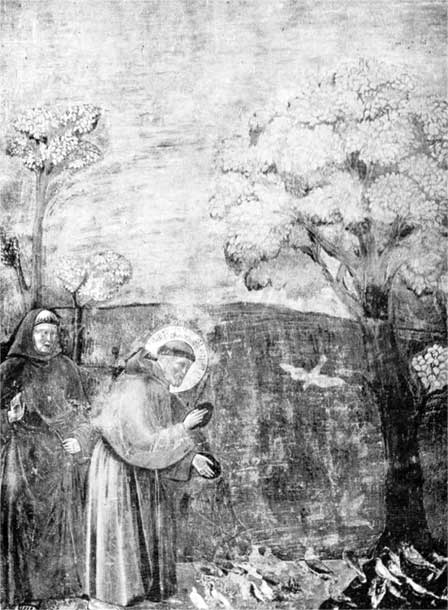 Вместо того чтобы представлять святых, как это было принято, в виде торжественных, статуарных, тяжелых, неподвижных фигур, написанных в фас, лицом к зрителю, Джотто стал изображать их без идеализации, как людей, движущихся в обычном, настоящем земном пространстве и живущих в земном времени. Прекрасным примером этого является фреска «Святой Франциск проповедует птицам» (рис. 2).