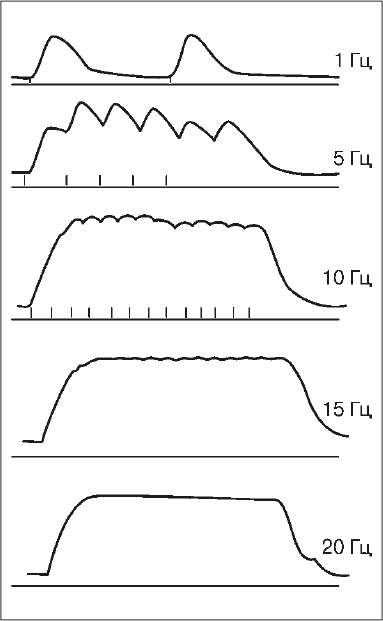 Рис. 11. Одиночное сокращение, зубчатый и сплошной тетанус камбаловидной мышцы человека (по: Н. В. Зимкин и др., 1984); верхняя кривая – сокращение мышцы, нижняя – отметка раздражения мышцы, справа указана частота раздражения
