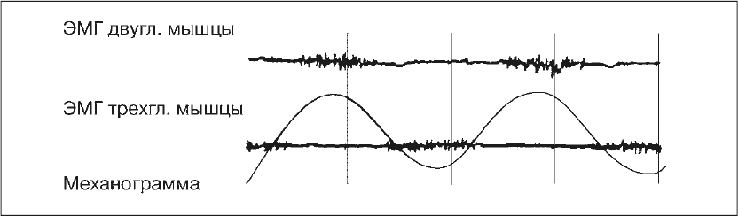 Рис. 13. Электромиограмма мышц-антагонистов при циклической работе