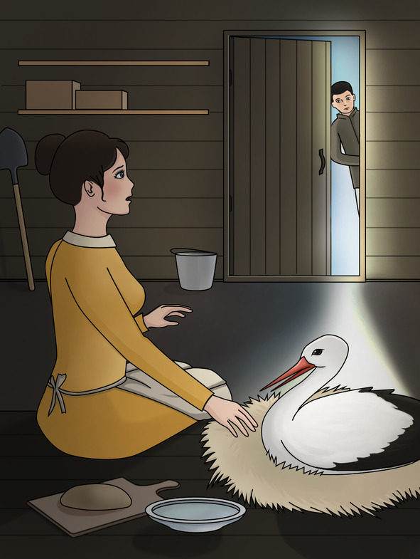 – Значит так, жила-была одна добрая женщина. Ее муж был… лесничим и целыми днями пропадал на работе, в лесу то есть. Ну а женщина занималась хозяйством: прибирала в доме, готовила, стирала. Вот однажды прилетела к ним на двор диковинная птица: сама белая, а на краях черные отметины. Была она то ли раненой, то ли больной. В общем, пожалела ее женщина, стала тайно выхаживать: лечила всякими снадобьями, кормила отборным зерном, мягким хлебушком.