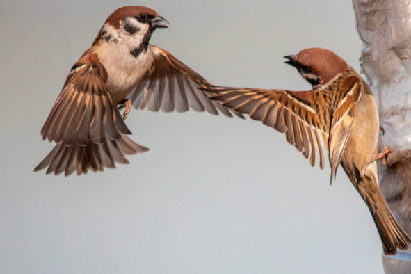 Не все знают, что воробьи даже в средней полосе России разные. Одних так и зовут домовыми (Passer domesticus), в то время как других – полевыми (Passer montanus). На первый взгляд они очень похожи, однако среди птиц часто встречаются очень похожие внешне, но принадлежащие к разным видам. Некоторых вообще можно достоверно определить, только взяв в руки. Однако к воробьям это не относится: знающий определит их по первому взгляду. На рис. 1 – домовый воробей, петушок (самец). Это у домашних животных, включая и птиц тоже, мальчики и девочки называются разными словами: баран и овца, бык и корова, курица и петух, утка и селезень, гусак и гусыня, индюк и индюшка. У диких же они называются обычно одним словом, к чему я до сих пор не привык: ворон – не муж вороны, а совсем другая птица. А муж вороны – тоже ворона, только он, а не она. По-учёному – самец вороны. Однако для самочки воробья тоже есть пусть и не научное, а шутливо-народное, но отдельное название – воробьиха. Это же почти что домашнее животное!