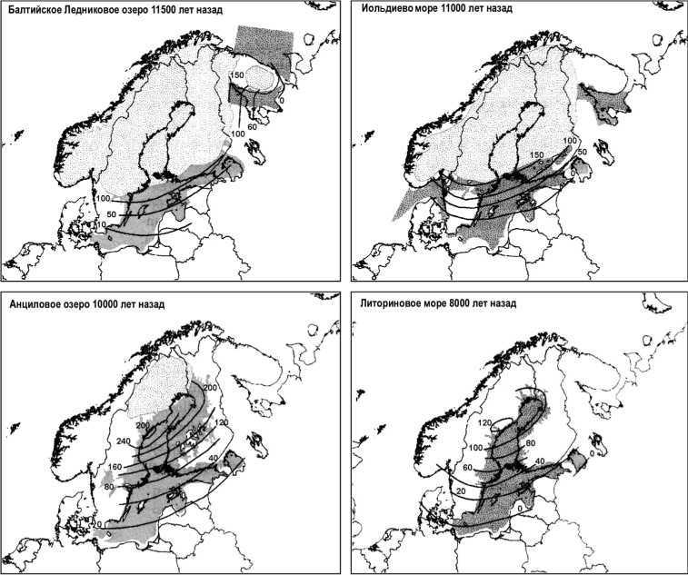 Рис. 2. Этапы послеледниковой истории Балтики. Изобазы отражают высотные отметки на разные этапы относительно современного уровня моря (по М. Saarnisto (2003))