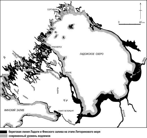 Отступление ледника привело к началу достаточно быстрого на раннем этапе подъема земной коры, придавленной и прогнутой в период оледенения гигантской массой льда. Соединявший Иольдиево море с океаном Средне-Шведский пролив вследствие этого мелел и сужался, пока около 10500-10700 лет назад бассейны Балтийского моря и Ладожского озера не утратили связь с океаном, став пресноводным Анциловым озером (9500-10700 л.н.) (рис. 2). Максимальная высота берега в северной части современного Ладожского озера достигала 30 м, на Карельском перешейке 10 (Зеленогорск) – 30 м (Выборг). Уровень воды в Анциловом озере, неуклонно поднимаясь, превысил существовавший в районе Датских проливов порог, после чего около 10100 л.н. начался его быстрый спад. Поднятие порога стока Ладожского озера в районе Хейнйоки (Вещево) и поступление вод Онежского озера через возникшую более 10000 лет назад Свирь означало начало самостоятельного развития Ладожского озера. Берега времени трансгрессии Анцилового озера хорошо прослеживаются на Карельском перешейке в виде высоких, почти отвесных уступов по берегу Финского залива. Продолжающееся таяние ледников настолько подняло уровень воды в Мировом океане, что соленая вода из него вновь около 9500 л. н. проникла в котловину Балтийского моря. В его истории начался этап так называемого Литоринового моря (рис. 2). На Карельском перешейке об этом предшествующем современному Балтийскому морю этапе развития Балтики (9500 – около 2500 л. н.) напоминают высокие береговые террасы на некотором удалении от берега Финского залива. С течением времени около 6000 лет назад поднятие земной коры остановило подъем уровня воды в Балтийском море, после чего он стал падать, приближаясь к современному. Максимум уровня воды на этапе Литоринового моря был в районе Санкт-Петербурга на 5-6 м выше современного, на Карельском перешейке в районе Зеленогорска на 10 м и в районе Выборга на 18-20 м. Выборгский залив был значительно шире и врезался вглубь Карельского перешейка. В районе Хейнйокского порога (скала Ветокаллио) стока воды Ладожского озера в Выборгский залив уровень воды Литоринового моря превышал поверхность скалы Ветокаллио на один-два метра, однако напор воды шел со стороны пресноводной Ладоги, уровень воды в которой (20,5 м над уровнем моря) был на несколько метров выше уровня Литоринового моря. Таким образом, еще в эпоху каменного века Ладожское озеро имело прямое сообщение с Балтийским морем через Хейнйокский (Гейниекский) пролив (рис. 3) (Нуурра 1942: 139-176; Dolukhanov 1979: 115-125; История Ладожского… 1990: 72-75; Saarnisto 2003: 51-62; Сакса 2006: 35-44).
