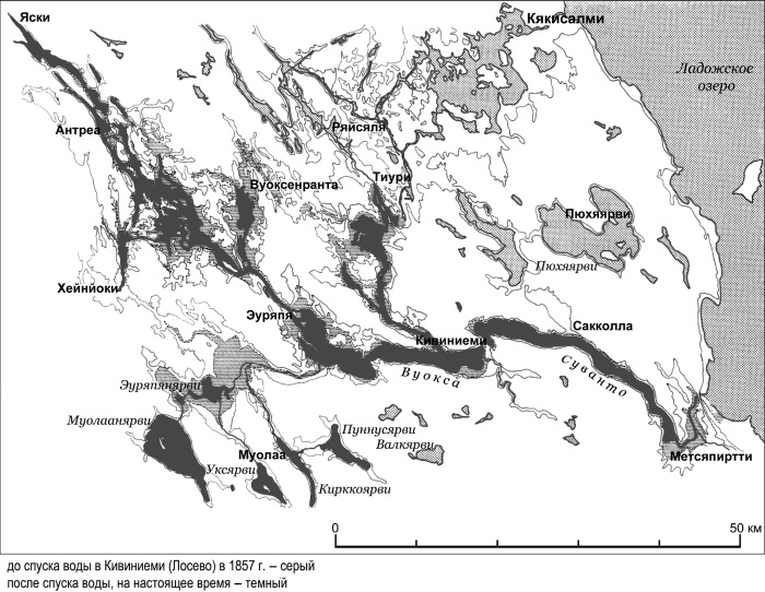 Рис. 4. Изменение размеров зеркала воды в Вуоксе в связи с человеческой деятельностью в XIX в. (по М. Saarnisto (2003))