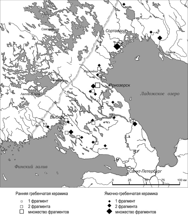С наступлением эпохи неолита, связанной с распространением с IV тысячелетия до н. э. ямочно-гребенчатой керамики (по финской терминологии – гребенчатой) и шлифованных каменных орудий, границы между культурными областями начинают приобретать все более отчетливый характер. В хозяйстве населения на рассматриваемой территории существенных изменений к этому времени еще не произошло. В окружающей природной среде в зоне существования поселений практически не фиксируются следы воздействия человека. Первые следы хозяйственного воздействия на природу (скотоводство?) относятся лишь ко времени около 2000 г. до н. э. (Simola 2003: 98-115). Ведущую роль по-прежнему играли традиционные для предшествующей мезолитической эпохи промыслы: охота, рыболовство и собирательство. Карельский перешеек, Северное Приладожье (Приладожская Карелия) и восточные части Финляндии входили в ареал распространения характерных для территории Верхней Волги, Оки, Валдая и Карелии форм орнаментации сосудов ямками и «гребенчатым» штампом. Северной границей этого ареала было южное побережье Белого моря, восточной – Северная Двина. В то же время Карельский перешеек, территория Карелии, современной Ленинградской области, Прибалтики и вся территория остальной Финляндии (на запад от Сайменской системы) входили в зону распространения ямочно-гребенчатой керамики западной группы. Рассматриваемая нами территория, таким образом, находилась в зоне наложения двух видов керамики. Южное Приладожье, как и остальная территория Ленинградской области, входило еще и в зону распространения нарвской культуры (Гурина 1967; Тимофеев 1985; Панкрушев 1978; Huurre 2000: 24-32; 2003: 183-225; Сакса 2001: 259-260).