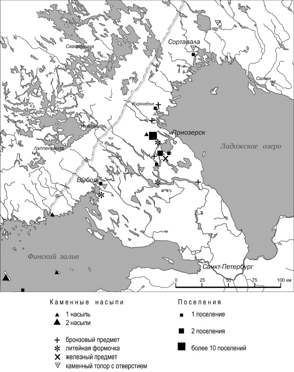 Рис. 6. Поселения, каменные насыпи и отдельные находки вещей эпохи бронзы и раннего металла (по М. Lavento (2003))