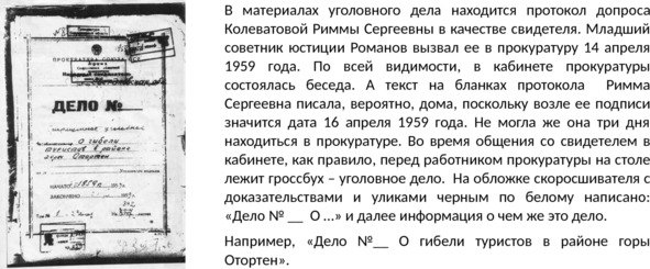 Вот что показал свидетель Колеватова Римма, после общения в кабинете прокуратуры: «При восхождении на гору Отортен 1—2 февраля этого года погибла группа туристов Уральского Политехнического института (в этой группе находился и мой брат Александр Сергеевич Колеватов, студент 4-го курса физико-технического факультета)». Выходит так, что в Свердловской областной прокуратуре в апреле 1959 года никто и не скрывал того факта, что группа погибла при восхождении на гору Отортен. Об этом свидетельствуют следующие доказательства, имеющиеся в деле – письмо прокурора Свердловской области Н. Клинова на имя директора Всесоюзного научно-исследовательского института криминалистики прокуратуры СССР профессору С.А.Голунскому. Дата отправления 3 апреля 1959 года, форма и способ отправления – заказное, авиа. Вот что пишет в обращении главный прокурор всех прокуроров области: «В феврале с.г. в Свердловской области произошло чрезвычайное происшествие – в районе горы Отортен погибла группа туристов в составе 9 человек (УД т.2; Наблюдательное дело, л.д.2)». Далее в письме Клинов поясняет, что в результате свободного поиска было обнаружено 4 трупа и лишь один труп найден путем прощупывания местности стальными двухметровыми щупами. Применение миноискателей не дало результатов, так как трупы полураздеты и не имеют относительно массивных металлических предметов. Весьма любопытно, откуда Клинов мог знать, что не найденные «трупы полураздеты и не имеют относительно массивных металлических предметов». Даже обычный свидетель в лице Колеватовой Риммы догадался о том, что четверо не найденных туристов были значительно теплее одеты, исходя из перечня предметов, которых не хватает среди вещей, обнаруженных в палатке. Данный вывод свидетеля отражен в протоколе допроса.