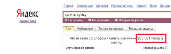 Чтобы узнать частоту запроса в месяц, воспользуемся сервисом подбора ключевых запросов Wordstat Yandex.