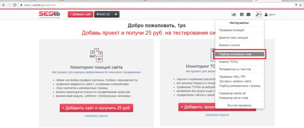 Далее нам нужно перейти в раздел «Инструменты» и выбрать пункт меню «Подбор ключевых слов».