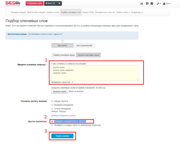 Затем настраиваем проект: вводим интересующие нас ключевые слова, выбираем регион продвижения, ставим галочку на пункте «Проверять конкурентность запроса» и жмем «Начать анализ».