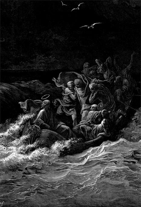 23. Во время плавания их Он заснул. На озере поднялся бурный ветер, и заливало их волнами, и они были в опасности.