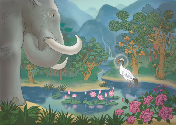 Standing at the edge of the marsh, the Elephant King was staring at the Crane. He placed his expectations on this bird towering like a statue over the marsh. Lanchenpo trod on slush, knelt down, took off his royal garland and put it on the Crane’s head. After that he appealed to the Crane. “O Great Sage, please, appear in our family in your next life!”