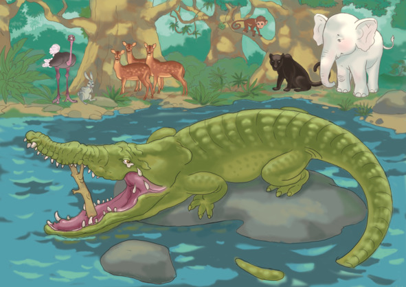 “I am the watering place. Just hop into my mouth and get as much water as you wish,” said the Crocodile King and opened his mouth as wide as possible.