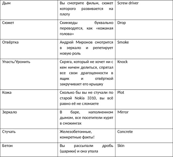 Я не заявляю, что это единственно верный и лёгкий метод, он точно не инновационный – уверяется, что его изобрёл Джордано Бруно- в начале вам будет порой казаться невозможным придумать образ или ассоциацию для того или иного слова, но обратите внимание, что помимо ассоциаций вы также задействуете элемент повторения (нам его привычнее называть зубрёжкой) и карточки, кроме того записывая, читая и произнося запоминаемые слова, вы задействуете все каналы восприятия. Какие слова учить решать вам, я бы рекомендовал начать с тех, что окружают вас. Мой коллега однажды поделился со мной высказыванием, которое он услышал от своего преподавателя в ВУЗе: «Если ты не знаешь как называется каждая вещь у тебя дома, то английский ты знаешь так себе». В прошлой главе мы с вами узнали, что слово вне контекста может быть сразу несколькими частями речи, а также иметь множество не связанных переводов, о последнем стоит поговорить отдельно. Когда вы будете учить слово, то запоминайте тот перевод, который вам нужен, в дальнейшем, углубляясь в язык, вы будете видеть это же слово уже в другом переводе, будете видеть его в предложении и таким наиболее естественным образом выработаете понимание этого слова с несколькими его толкованиями.