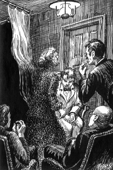Сказано – сделано. Понемногу комната осветилась. Медиум лежал, откинувшись в кресле, лицо его было бледным, на лбу выступил пот. Жена суетилась вокруг него, расстегивая воротничок и смачивая водой лицо. Гости, разбившись на группы, обсуждали увиденное.