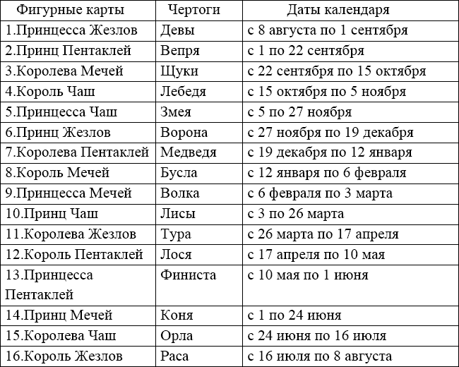Таблица соответствий Фигурных карт Младших Арканов Таро с датами по кругу Сварога: