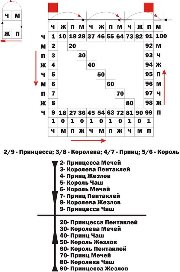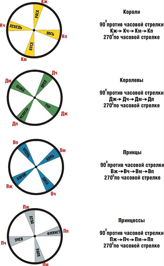 2-я – Король жезлов, королева чаш, принц мечей, принцесса пентаклей; Король мечей, королева пентаклей, принц жезлов, принцесса чаш.