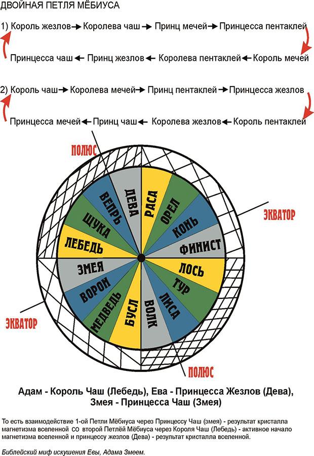 Учитывая тотемные знаки круга сварога и изображение 21 аркана таро как Фальконнье так и Уэйта, поясню библейский миф искушения яблоком с древа познания Адама и Евы – Змеем: иносказательно Адам – Король чаш (чертог Лебедя), Ева – Принцесса жезлов (чертог Девы), Змей – Принцесса чаш (чертог Змея). То есть взаимодействие 1-ой «петли мёбиуса» круга сварога через принцессу чаш (чертог змея) – результат кристалла магнетизма вселенной (змей олицетворяет «стоячую» акустическую волну) со второй «петлёй мёбиуса» через короля чаш (чертог лебедя) – активное начало магнетизма вселенной и принцессу жезлов (чертог девы) – результат кристалла электричества вселенной.