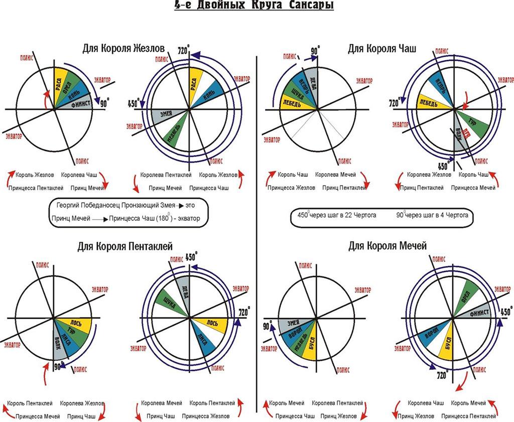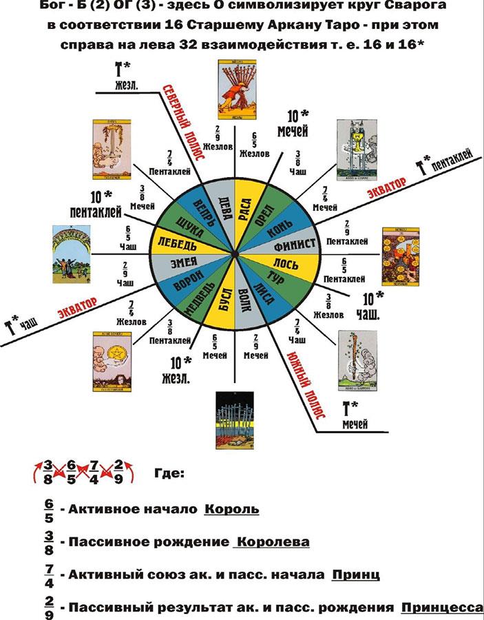 При дальнейшем анализе, наблюдаем для каждого из Королей в движении по часовой стрелке 4 сферы взаимодействия. Для короля чаш – королева мечей, принц пентаклей, принцесса жезлов. Для короля жезлов – королева чаш, принц мечей, принцесса пентаклей. Для короля пентаклей – королева жезлов, принц чаш, принцесса мечей. Для короля мечей – королева пентаклей, принц жезлов, принцесса чаш. В контексте с данными сферами взаимодействия так называемое «видение иезекииля» как и рассказ Рэймонда Фишера Джоунса «Уровень шума» несут один и тот же посыл для расшифровки древнего знания предков человечества. По аналогии, учитывая изображение 21 аркана Фальконнье как и Уэйта, наблюдаем взаимосвязь между тотемными знаками круга сварога 16-ти ф.а.к.т., а именно: