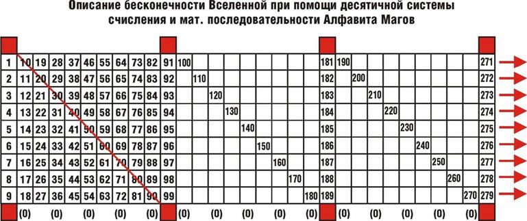Как мы видим, данная таблица напоминает резьбу с перегородками при шаге в 81=9*9. Математическая модель вселенной, в описании десятеричной системы счисления, напрямую связана с русским языком и алфавитом магов, так как для 1-го старшего аркана таро – в соответствии букв – а, я – т. е. окончания слов женского рода – нечётные 3,5,7,9 – означают пассивное рождение – магнетизм; для 10 старшего аркана таро, в соответствии букв – и, й, ы – т. е. окончания слов мужского рода – чётные 2,4,6,8 – означают активное начало – электричество. Ноль, согласно алфавиту магов, соответствует 18 старшему аркану таро, и как бы не показалось странным, всё это возможно объяснить только вспомнив «эффект джанибекова» – когда после двух витков система переворачивается и 19 соответствует 1, где после соответствующих двух витков замкнутость системы в продолжении соответствует 36 (второй ноль), – далее, в продолжении десятеричной системы счисления, всё повторяется до бесконечности.