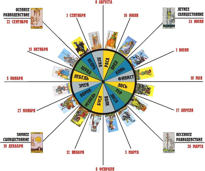 Опираясь на классическое изображение Таро Артура Эдварда Уэйта, обратим внимание на изображение тузов номерных арканов карт таро, – на каждом из тузов жезлов, чаш, мечей, пентаклей, мы видим рисунок правой руки в динамике держащую солнце. Единственное логическое объяснение этим рисункам – два равноденствия и два солнцестояния, запечатлённые иносказательно Уэйтом. Помимо этого уточню, что по Уэйту, Папюсу и другим таролагам – астрономически жезлы означают весну, чаши лето, мечи осень, пентакли зиму, – то есть туз пентаклей это зимнее солнцестояние, а туз чаш летнее; туз жезлов это весеннее равноденствие, а туз мечей осеннее. После доказательства идентичности 16-ти ф.а.к.т. с кругом сварога приведённое ранее и переводом переходов тотемных знаков круга сварога на современные календарные даты, у нас получились закреплённые в системе таро дни для уточнения астрономической даты создания системы таро, а значит и русского языка: