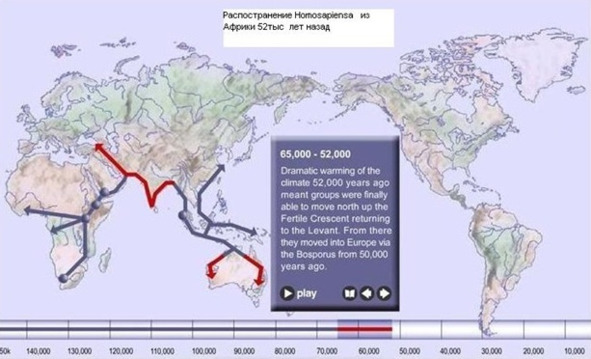 The exit from Africa of Homo sapiens and the development of other continents in time is shown on the map: