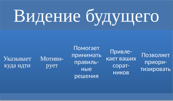 Это видение закрепляется в головах людей, и компании легче двигаться дальше, так как и руководитель, и подчиненные имеют одну и ту же картинку в голове. Единое видение позволяет достичь много чего.