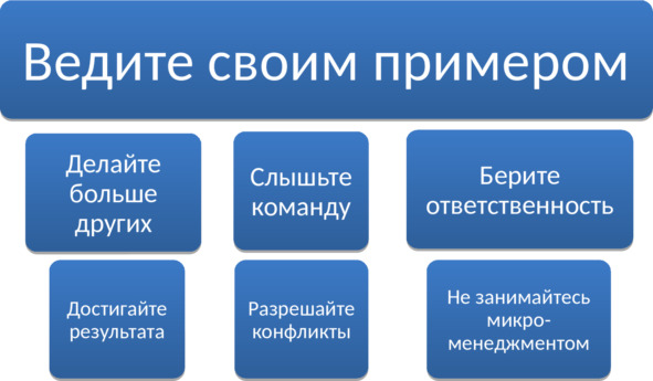 Вести своим примером в том числе означает, что вы не должны бояться «грязной работы». Если у команды где-то проблема, вам надо самому засучить рукава и действовать. Даже если надо делать вещи, которые вам несвойственны или неприятны. Один из руководителей рассказывал, что если он видел, что что-то не получалось, то он садился сам и разбирал каждый процесс на «винтики», чтобы понять, что не работает.