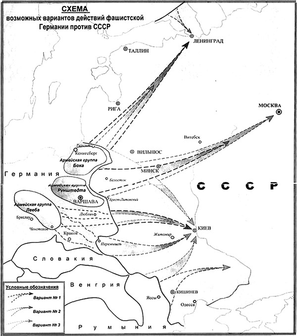 Схема возможных вариантов действий фашистской Германии против СССР, представленная генерал-майором В.И. Тупиковым в РУ ГШ Красной Армии. На схеме фамилии командующих группами армий вермахта указаны по состоянию на март 1941 г. на основании имевшихся у Тупикова в тот момент агентурных и иных данных. К 22 июня Гитлер перетасовал командующих: фон Лееб возглавил ГА «Север», Рундштедт – ГА «Юг», фон Бок – ГА «Центр»