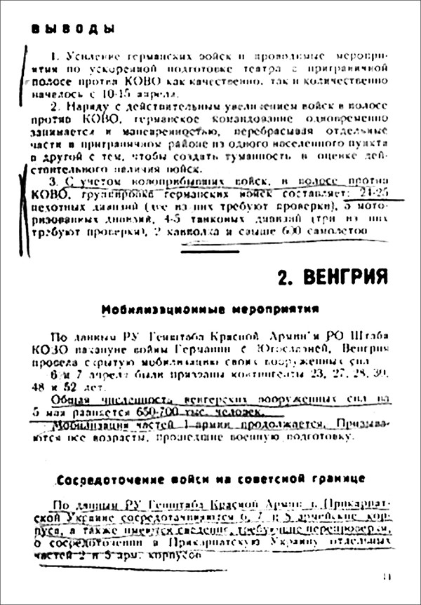«Германское командование усиливает группировку войск в пограничной с СССР полосе, производя массовые переброски войск из глубинных районов Германии, оккупированных стран Западной Европы и с Балкан. Это усиление не вызывает никакого сомнения. Однако наряду с действительным увеличением войскв пограничной полосегерманское командование одновременно занимается и маневрированием, перебрасывая отдельные части в приграничном районе из одного населенного пункта в другой, с тем, чтобы в случае их оценки у нас создалось нужное германскому командованию впечатление.